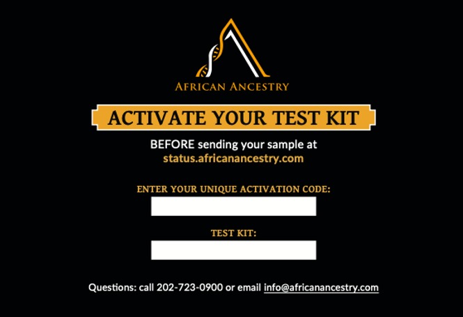 Activating your kit is required. It is a crucial part of the process. It allows us to protect your identity and associate your information with your swabs. Because it is so important, we make it quick and easy to find your activation code. The activation information is on the opposite side of the Instruction Card. Both numbers are unique to you are required to activate your kit online at status.africanancestry.com